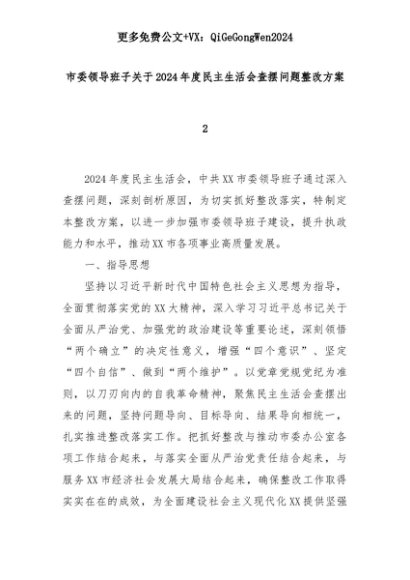 【七哥公文】2025年:市委领导班子关于2024年度民主生活会查摆问题整改方案2+更多免费公文+VX:QiGeGongWen2024+更多免费公文+VX:QiGeGongWen2024