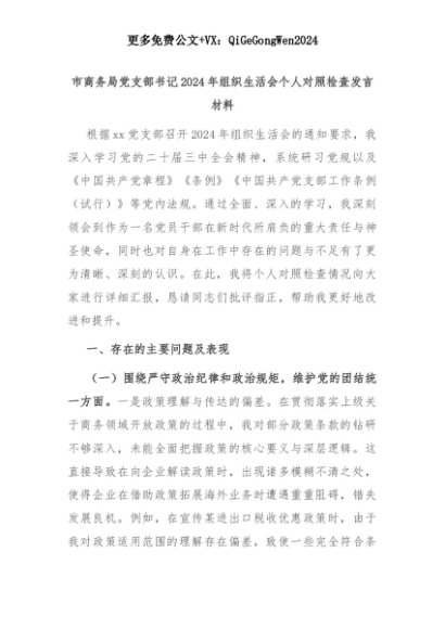 【七哥公文】2025年:市商务局党支部书记2024年组织生活会个人对照检查发言材料+更多免费公文+VX:QiGeGongWen2024+更多免费公文+VX:QiGeGongWen2024