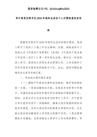 【七哥公文】2025年:审计局党支部书记2024年组织生活会个人对照检查发言材料+更多免费公文+VX:QiGeGongWen2024+更多免费公文+VX:QiGeGongWen2024
