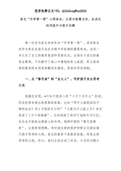 【七哥公文】2025年:家长“开学第一课”心得体会:以爱与智慧为舟,在成长的河流中与孩子共舞+更多免费公文+VX:QiGeGongWen2024+更多免费公文+VX:QiGeGongWen2024
