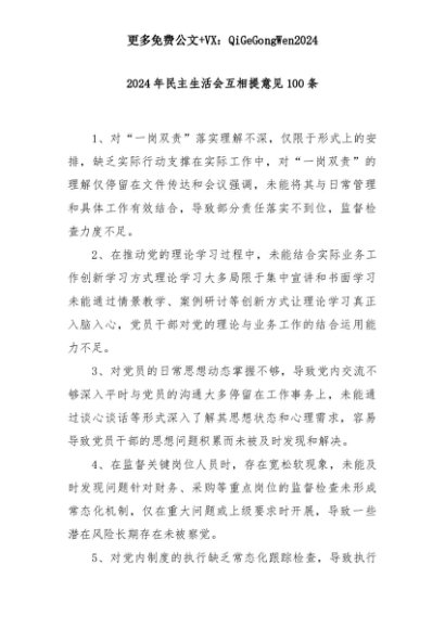 【七哥公文】2025年:2024年民主生活会互相提意见100条+更多免费公文+VX:QiGeGongWen2024+更多免费公文+VX:QiGeGongWen2024