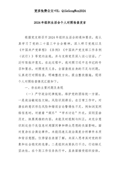 【七哥公文】2025年:2024年组织生活会个人对照检查发言+更多免费公文+VX:QiGeGongWen2024+更多免费公文+VX:QiGeGongWen2024