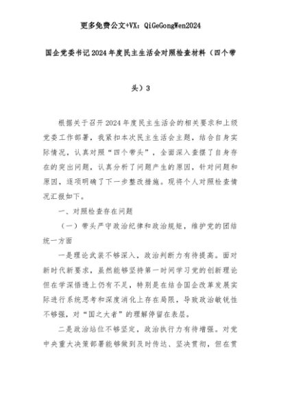 【七哥公文】2025年:国企党委书记2024年度民主生活会对照检查材料(四个带头)3+更多免费公文+VX:QiGeGongWen2024+更多免费公文+VX:QiGeGongWen2024