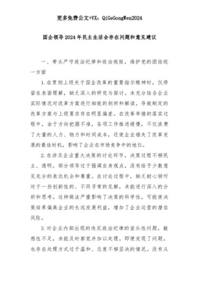 【七哥公文】2025年:国企领导2024年民主生活会存在问题和意见建议+更多免费公文+VX:QiGeGongWen2024+更多免费公文+VX:QiGeGongWen2024