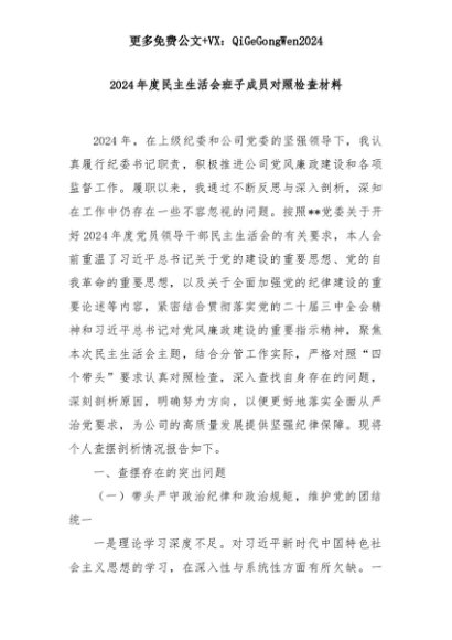 【七哥公文】2025年:2024年度民主生活会班子成员对照检查材料+更多免费公文+VX:QiGeGongWen2024+更多免费公文+VX:QiGeGongWen2024