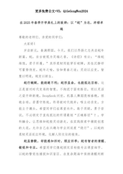 【七哥公文】2025年:在2025年春季开学典礼上的致辞:以“蛇”为志,淬砺卓越+更多免费公文+VX:QiGeGongWen2024+更多免费公文+VX:QiGeGongWen2024