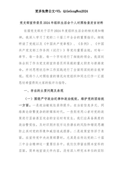 【七哥公文】2025年:党支部宣传委员2024年组织生活会个人对照检查发言材料+更多免费公文+VX:QiGeGongWen2024+更多免费公文+VX:QiGeGongWen2024