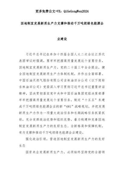 【七哥公文】2025年:因地制宜发展新质生产力支撑和推动千万吨级绿色能源企业建设+更多免费公文+VX:QiGeGongWen2024+更多免费公文+VX:QiGeGongWen2024