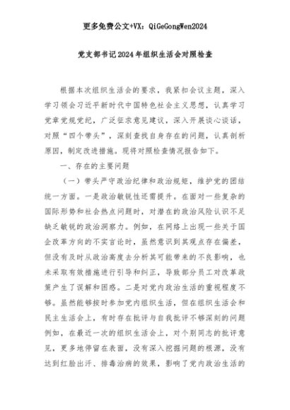 【七哥公文】2025年:党支部书记2024年组织生活会对照检查+更多免费公文+VX:QiGeGongWen2024+更多免费公文+VX:QiGeGongWen2024