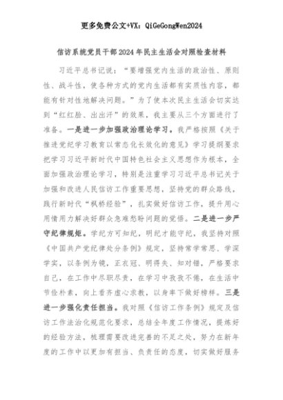 【七哥公文】2025年:信访系统党员干部2024年民主生活会对照检查材料+更多免费公文+VX:QiGeGongWen2024+更多免费公文+VX:QiGeGongWen2024
