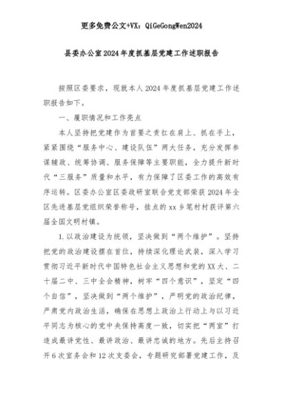 【七哥公文】2025年:县委办公室2024年度抓基层党建工作述职报告+更多免费公文+VX:QiGeGongWen2024+更多免费公文+VX:QiGeGongWen2024