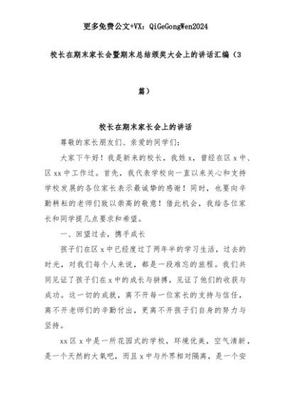 【七哥公文】2025年:(3篇)校长在期末家长会暨期末总结颁奖大会上的讲话汇编+更多免费公文+VX:QiGeGongWen2024+更多免费公文+VX:QiGeGongWen2024