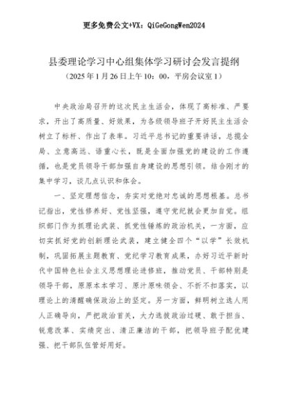 【七哥公文】2025年:县委理论学习中心组集体学习研讨会发言提纲(20250126)+更多免费公文+VX:QiGeGongWen2024+更多免费公文+VX:QiGeGongWen2024