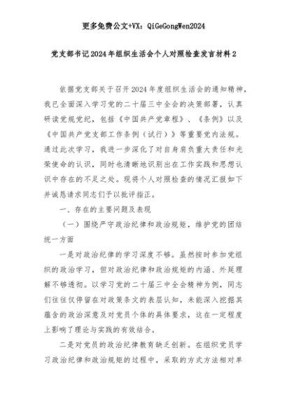 【七哥公文】2025年:党支部书记2024年组织生活会个人对照检查发言材料2+更多免费公文+VX:QiGeGongWen2024+更多免费公文+VX:QiGeGongWen2024