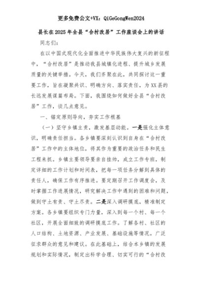 【七哥公文】2025年:县长在2025年全县“合村改居”工作座谈会上的讲话+更多免费公文+VX:QiGeGongWen2024+更多免费公文+VX:QiGeGongWen2024