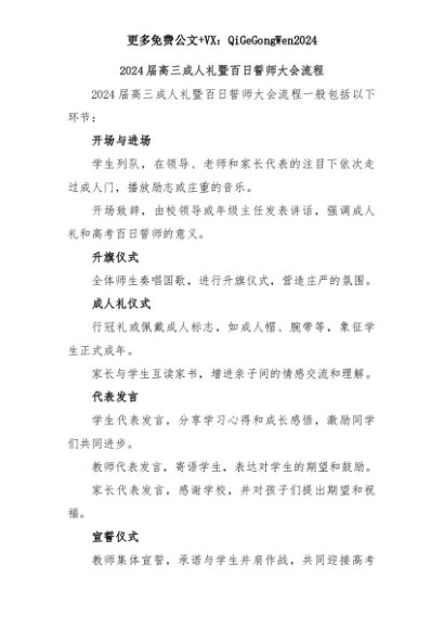 【七哥公文】2025年:2024届高三成人礼暨百日誓师大会流程+更多免费公文+VX:QiGeGongWen2024+更多免费公文+VX:QiGeGongWen2024