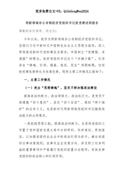 【七哥公文】2025年:两新领域非公有制经济党组织书记抓党建述职报告+更多免费公文+VX:QiGeGongWen2024+更多免费公文+VX:QiGeGongWen2024