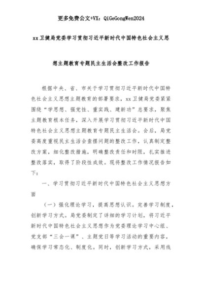 【七哥公文】2025年:xx卫健局党委学习贯彻习近平新时代中国特色社会主义思想主题教育专题民主生活会整改工作报告+更多免费公文+VX:QiGeGongWen2024+更多免费公文+VX:QiGeGongWen2024