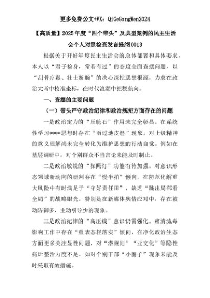 【七哥公文】2025年:【高质量】2025年度“四个带头”及典型案例的民主生活会个人对照检查发言提纲0013+更多免费公文+VX:QiGeGongWen2024+更多免费公文+VX:QiGeGongWen2024