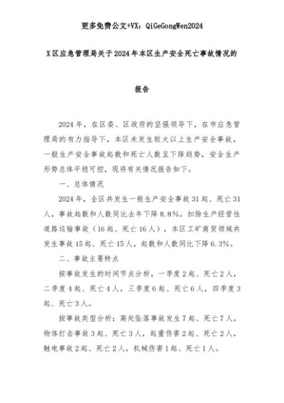 【七哥公文】2025年:X区应急管理局关于2024年本区生产安全死亡事故情况的报告+更多免费公文+VX:QiGeGongWen2024+更多免费公文+VX:QiGeGongWen2024