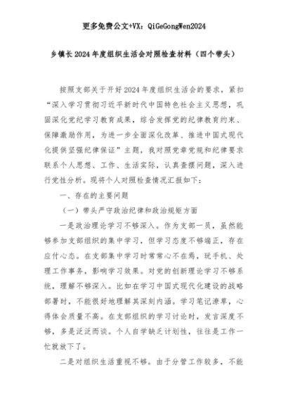 【七哥公文】2025年:乡镇长2024年度组织生活会对照检查材料(四个带头)+更多免费公文+VX:QiGeGongWen2024+更多免费公文+VX:QiGeGongWen2024