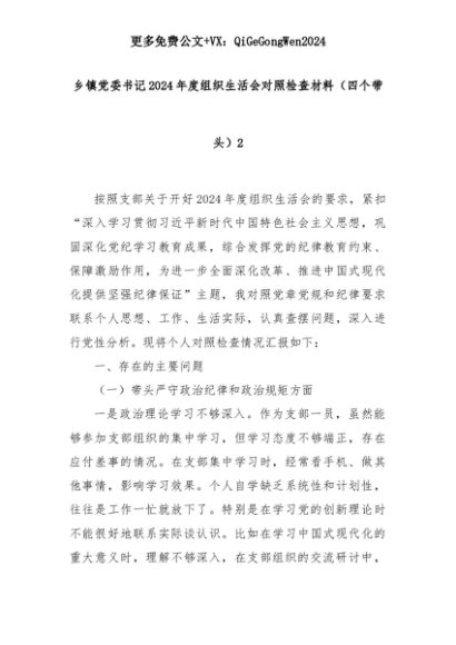 【七哥公文】2025年:乡镇党委书记2024年度组织生活会对照检查材料(四个带头)2+更多免费公文+VX:QiGeGongWen2024+更多免费公文+VX:QiGeGongWen2024