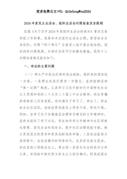 【七哥公文】2025年:2024年度民主生活会、组织生活会对照检查发言提纲+更多免费公文+VX:QiGeGongWen2024+更多免费公文+VX:QiGeGongWen2024