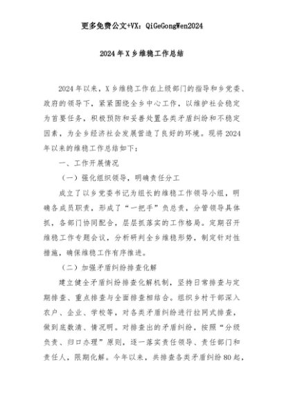 【七哥公文】2025年:2024年X乡维稳工作总结+更多免费公文+VX:QiGeGongWen2024+更多免费公文+VX:QiGeGongWen2024