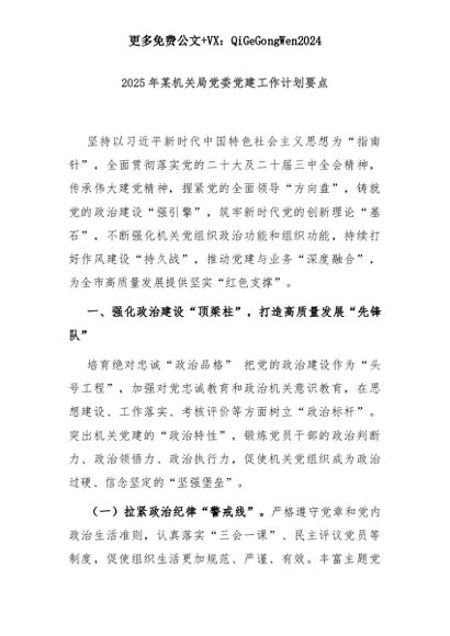 【七哥公文】2025年:2025年某机关局党委党建工作计划要点+更多免费公文+VX:QiGeGongWen2024+更多免费公文+VX:QiGeGongWen2024