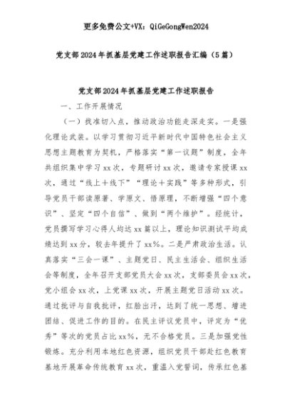 【七哥公文】2025年:(5篇)党支部2024年抓基层党建工作述职报告汇编+更多免费公文+VX:QiGeGongWen2024+更多免费公文+VX:QiGeGongWen2024