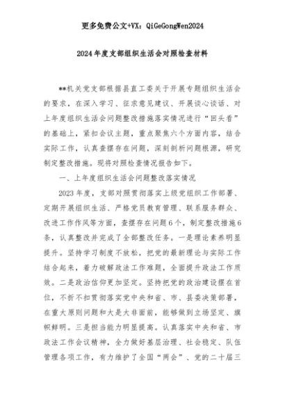 【七哥公文】2025年:2024年度支部组织生活会对照检查材料+更多免费公文+VX:QiGeGongWen2024+更多免费公文+VX:QiGeGongWen2024