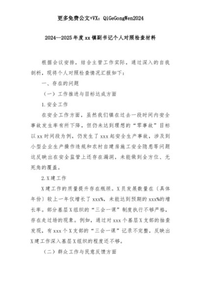 【七哥公文】2025年:2024--2025年度xx镇副书记个人对照检查材料+更多免费公文+VX:QiGeGongWen2024+更多免费公文+VX:QiGeGongWen2024