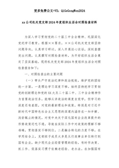 【七哥公文】2025年:xx公司机关党支部2024年度组织生活会对照检查材料+更多免费公文+VX:QiGeGongWen2024+更多免费公文+VX:QiGeGongWen2024