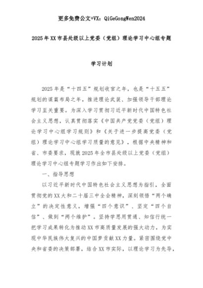 【七哥公文】2025年:2025年XX市县处级以上党委(党组)理论学习中心组专题学习计划+更多免费公文+VX:QiGeGongWen2024+更多免费公文+VX:QiGeGongWen2024