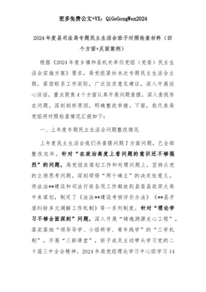 【七哥公文】2025年:2024年度县司法局专题民主生活会班子对照检查材料(四个方面+反面案例)+更多免费公文+VX:QiGeGongWen2024+更多免费公文+VX:QiGeGongWen2024