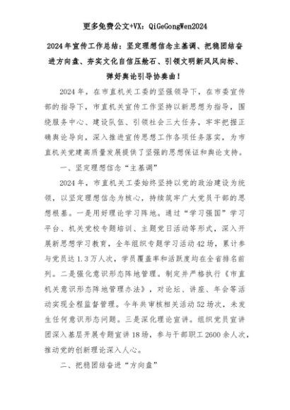 【七哥公文】2025年:2024年宣传工作总结:坚定理想信念主基调、把稳团结奋进方向盘、夯实文化自信压舱石、引领文明新风风向标、弹好舆论引导协奏曲!+更多免费公文+VX:QiGeGongWen2024+更多免费公文+VX:QiGeGongWen2024