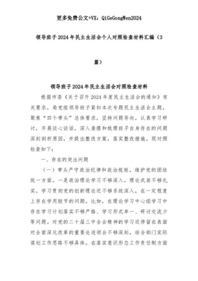 【七哥公文】2025年:(3篇)领导班子2024年民主生活会个人对照检查材料汇编+更多免费公文+VX:QiGeGongWen2024+更多免费公文+VX:QiGeGongWen2024