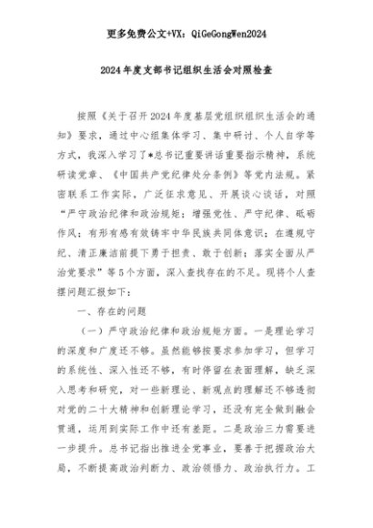 【七哥公文】2025年:2024年度支部书记组织生活会对照检查+更多免费公文+VX:QiGeGongWen2024+更多免费公文+VX:QiGeGongWen2024