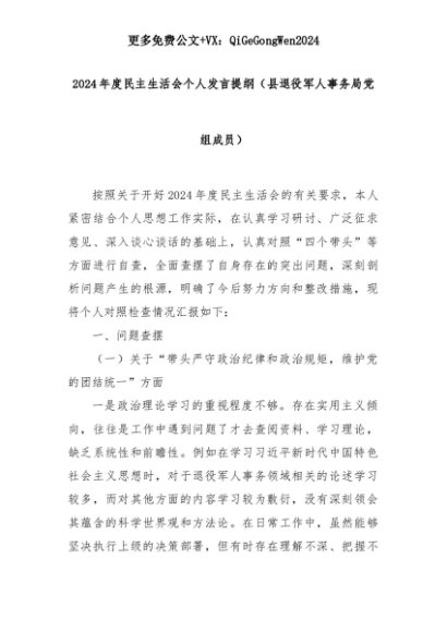 【七哥公文】2025年:2024年度民主生活会个人发言提纲(县退役军人事务局党组成员)+更多免费公文+VX:QiGeGongWen2024+更多免费公文+VX:QiGeGongWen2024