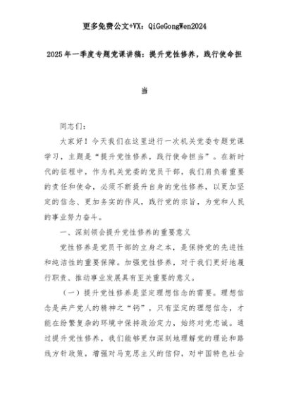 【七哥公文】2025年:2025年一季度专题党课讲稿:提升党性修养,践行使命担当+更多免费公文+VX:QiGeGongWen2024+更多免费公文+VX:QiGeGongWen2024