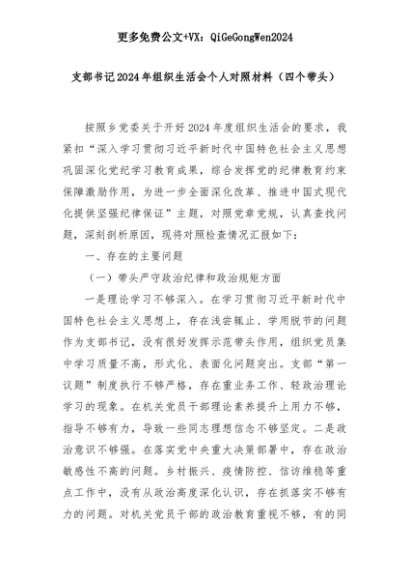 【七哥公文】2025年:支部书记2024年组织生活会个人对照材料(四个带头)+更多免费公文+VX:QiGeGongWen2024+更多免费公文+VX:QiGeGongWen2024