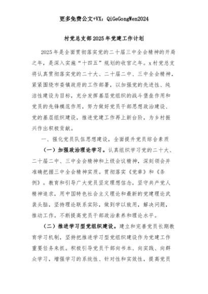 【七哥公文】2025年:村党总支部2025年党建工作计划+更多免费公文+VX:QiGeGongWen2024+更多免费公文+VX:QiGeGongWen2024