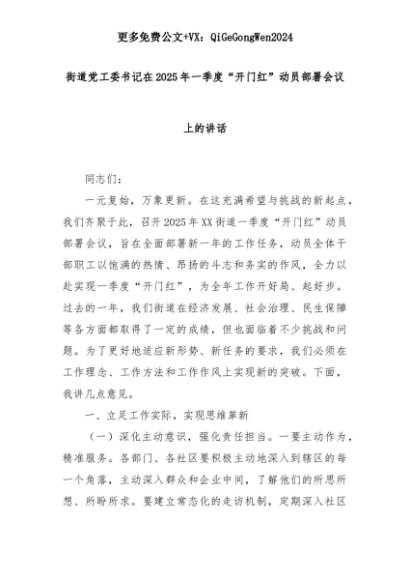 【七哥公文】2025年:街道党工委书记在2025年一季度“开门红”动员部署会议上的讲话+更多免费公文+VX:QiGeGongWen2024+更多免费公文+VX:QiGeGongWen2024