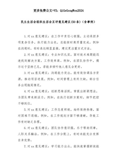 【七哥公文】2025年:(50条)民主生活会组织生活会互评意见建议(含事例)+更多免费公文+VX:QiGeGongWen2024+更多免费公文+VX:QiGeGongWen2024