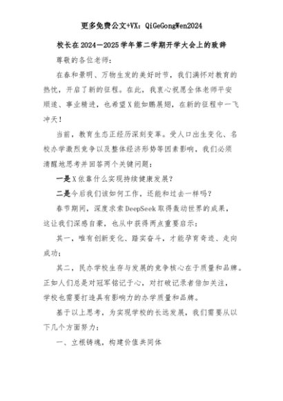 【七哥公文】2025年:校长在2024-2025学年第二学期开学大会上的致辞+更多免费公文+VX:QiGeGongWen2024+更多免费公文+VX:QiGeGongWen2024