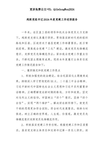 【七哥公文】2025年:残联党组书记2024年度党建工作述职报告+更多免费公文+VX:QiGeGongWen2024+更多免费公文+VX:QiGeGongWen2024