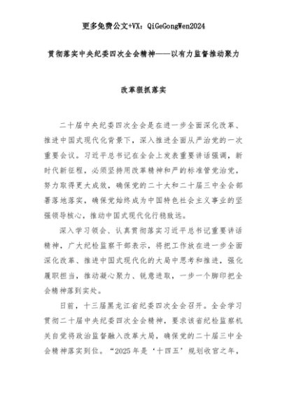 【七哥公文】2025年:贯彻落实中央纪委四次全会精神——以有力监督推动聚力改革狠抓落实+更多免费公文+VX:QiGeGongWen2024+更多免费公文+VX:QiGeGongWen2024