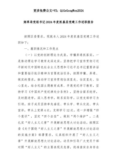 【七哥公文】2025年:烟草局党组书记2024年度抓基层党建工作述职报告+更多免费公文+VX:QiGeGongWen2024+更多免费公文+VX:QiGeGongWen2024