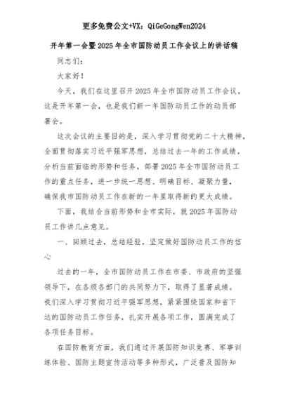 【七哥公文】2025年:开年第一会暨2025年全市国防动员工作会议上的讲话稿+更多免费公文+VX:QiGeGongWen2024+更多免费公文+VX:QiGeGongWen2024