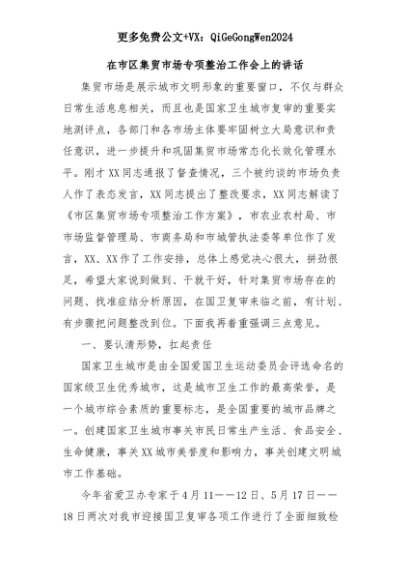 【七哥公文】2025年:在市区集贸市场专项整治工作会上的讲话+更多免费公文+VX:QiGeGongWen2024+更多免费公文+VX:QiGeGongWen2024